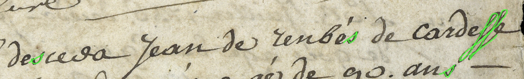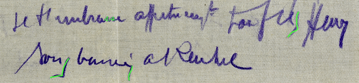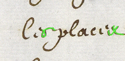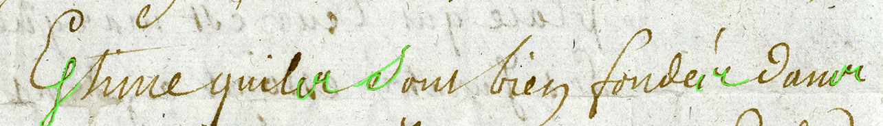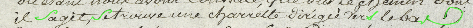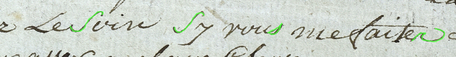 La première image montre le texte. Vous pouvez essayer de repérer les S. Dans la deuxième, les S sont surlignés en vert. Repérez leur emplacement, revenez si besoin à la première vue pour bien observer la forme de la lettre. La troisième image vous indique en orange les télescopages de lettres, les lettres précédents le S qui influencent la forme de ce dernier (E ou R).